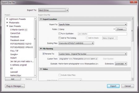 3. Ideálně si všechna zkopírujte do adresáře, kde máte uložený svůj katalog, protože nyní se všechny exportní nastavení ukládají právě a pouze tam. V mém případě mám katalog na discích v poli typu RAID 1, mirror, takže I:\katalog-2010\Lightroom Settings. Exporty najdete pod Export Presets. Mají příponu <jméno>.lrtemplate